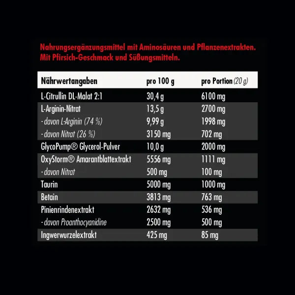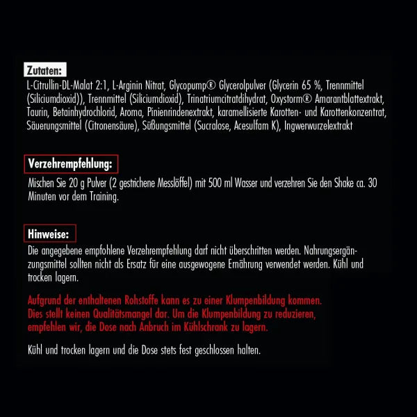Zutaten: L-Citrullin-DL-Malat 2:1, L-Arginin-Nitrat, GlycoPump® Glycerolpulver (Glycerin, Trennmittel: Siliciumdioxid), OxyStorm® Amarantblattextrakt, Taurin, Betainhydrochlorid, Pinienrindenextrakt, Ingwerwurzelextrakt, Aroma, karamellisierte Karotten- und Karottenkonzentrat, Säuerungsmittel: Citronensäure, Süßungsmittel: Sucralose, Acesulfam K.