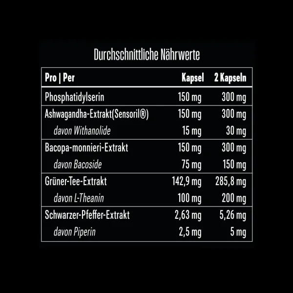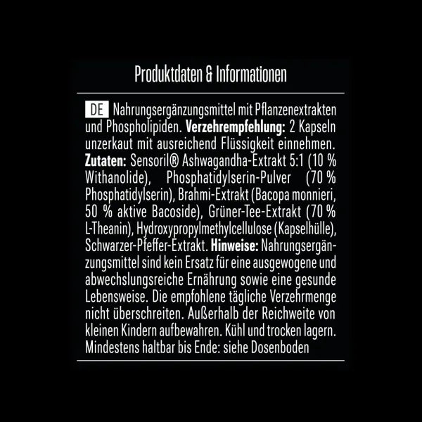 Zutaten: Sensoril® Ashwagandha-Extrakt 5:1 (10 % Withanolide), Phosphatidylserin-Pulver (70 % Phosphatidylserin), Bacopa-monnieri-Extrakt (50 % aktive Bacoside), Grüner-Tee-Extrakt (70 % L-Theanin), Kapselhülle – Hydroxypropylmethylcellulose, Schwarzer-Pfeffer-Extrakt.