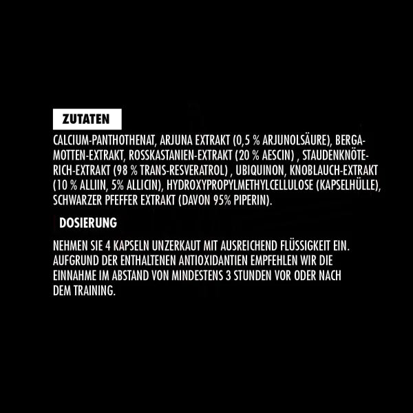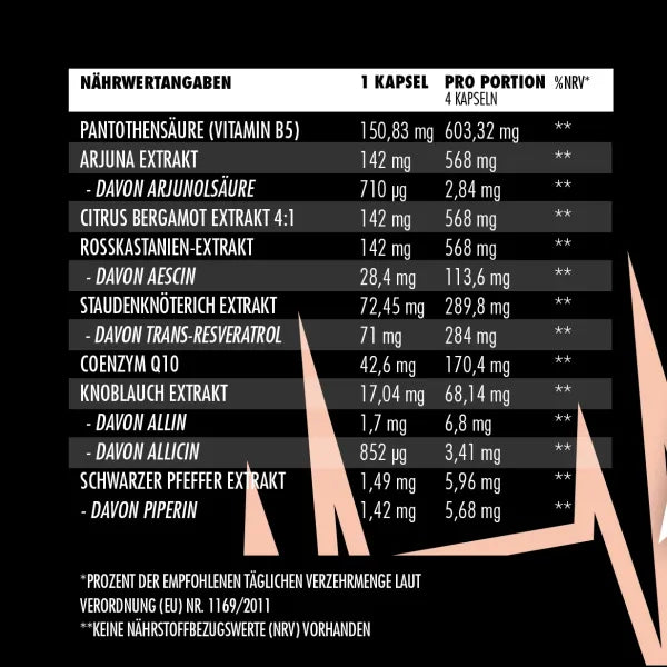 Zutaten: Calcium-Panthothenat, Arjuna Extrakt (0,5 % Arjunolsäure), Bergamotten-Extrakt, Rosskastanien-Extrakt (20 % Aescin), Staudenknöterich-Extrakt (98 % Trans-Resveratrol), Ubiquinon, Knoblauch-Extrakt (10 % Alliin, 5 % Allicin), Hydroxypropylmethylcellulose (Kapselhülle), Schwarzer Pfeffer-Extrakt (davon 95 % Piperin).