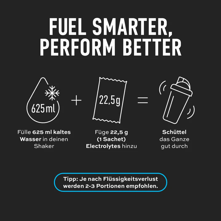Ein Sachet (22,5 g) mit 625 ml kaltem Wasser in einem Shaker mixen und nach Bedarf vor, während und/oder nach dem Training trinken. Je nach Flüssigkeitsverlust werden 2–3 Portionen empfohlen.