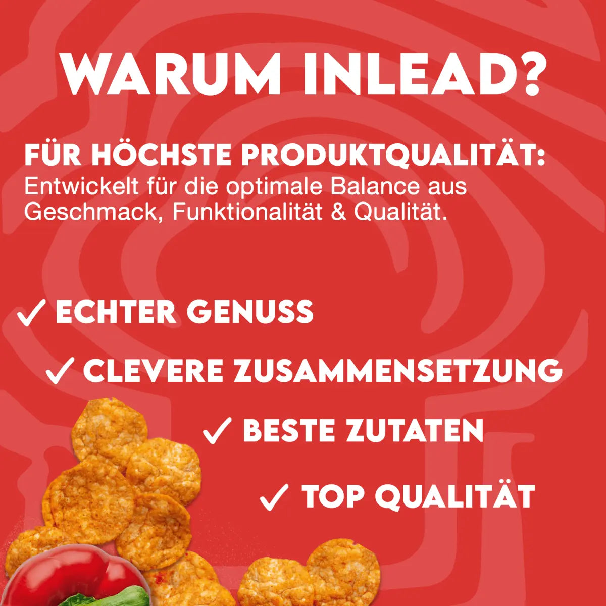 INLEAD Protein Chips Paprika sind knusprige Soja-Proteinchips mit erhöhtem Proteingehalt. Die Rezeptur basiert auf Sojaproteinkonzentrat und Tapiokastärke und enthält Sonnenblumenöl sowie eine Paprikawürzmischung für den Geschmack. Mit 35 g Protein pro 100 g bieten die Chips eine proteinreiche Snackoption. Der Fett- und Kohlenhydratanteil ist im Vergleich zu herkömmlichen Kartoffelchips reduziert. Die Verpackung erfolgt unter Schutzatmosphäre zur Sicherung der Produktqualität. Die Chips sind palmölfrei gemäß Herstellerangaben.