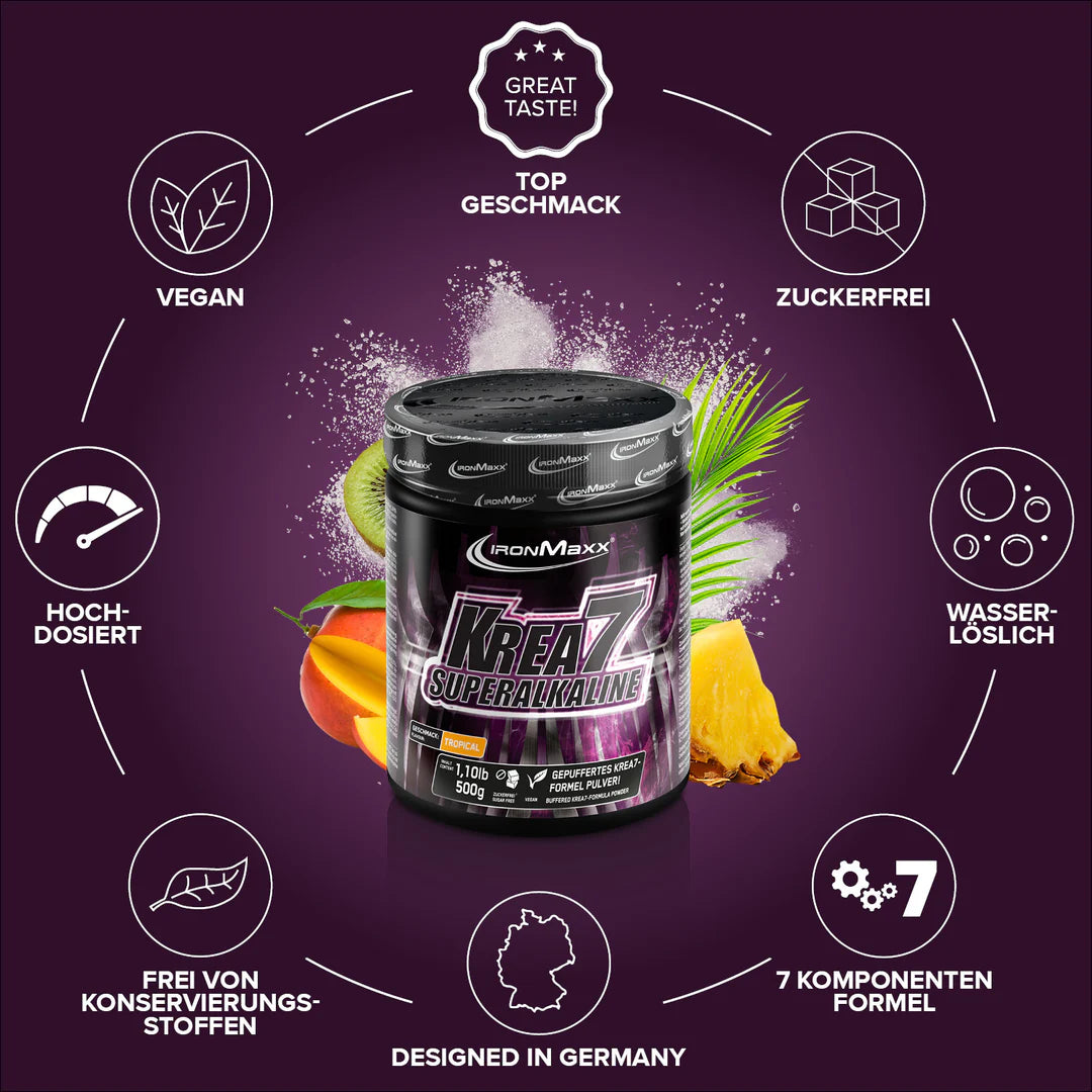 IronMaxx Krea7 Superalkaline Powder ist ein Nahrungsergänzungsmittel in Pulverform mit einer Kombination aus sechs verschiedenen Kreatinverbindungen und Natriumbicarbonat. Pro Portion von 10 g enthält das Produkt 7524 mg Kreatin aus Tricreatinmalat, Creatindinatriumphosphat, Creatinalphaketoglutarat, Tricreatincitrat, Creatinhydrochlorid und Creatinpyruvat sowie 458 mg Natriumbicarbonat. Das Pulver ist mit Süßungsmitteln versehen und wird zur Zubereitung eines Getränks mit Wasser verwendet.