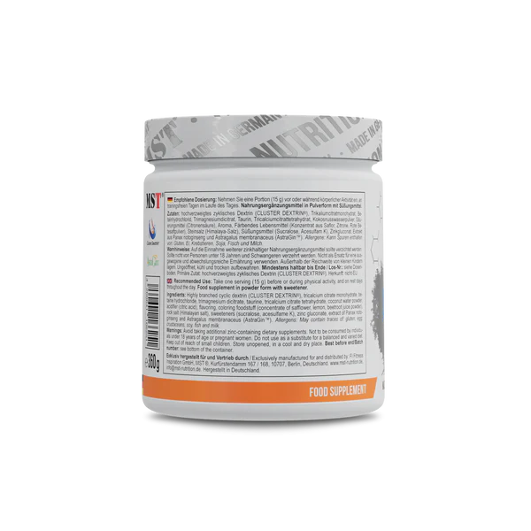 MST AquaPower Boost 360 g Orange ist ein Nahrungsergänzungsmittel in Pulverform mit Elektrolyten und funktionellen Inhaltsstoffen. Das Produkt enthält unter anderem hochverzweigtes zyklisches Dextrin (Cluster Dextrin®), Taurin, Betainhydrochlorid, Mineralien sowie den pflanzlichen Extrakt AstraGin™ (Panax notoginseng und Astragalus membranaceus). Die Nettofüllmenge beträgt 360 g. Das Produkt ist als Nahrungsergänzungsmittel gekennzeichnet.