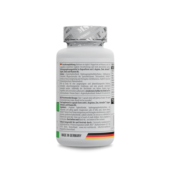 Zutaten: L‑Argininhydrochlorid, Hydroxypropylmethylcellulose (Kapselhülle), Zinkbisglycinat, Trennmittel – Magnesiumsalze der Speisefettsäuren, Siliciumdioxid, Extrakt aus Panax notoginseng und Astragalus membranaceus (AstraGin™), Kupfer(II)‑gluconat, Pyridoxinhydrochlorid, Natriumselenit.
