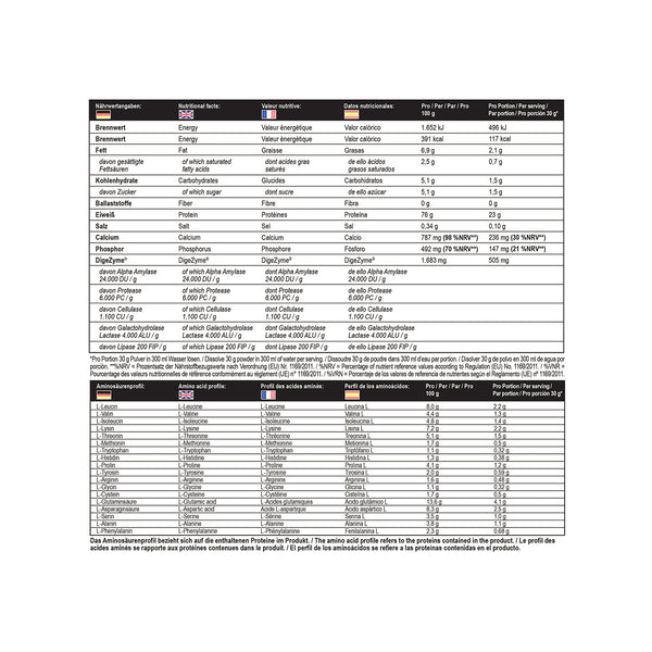 Zutaten: Milchprotein (Molkenproteinkonzentrat, Emulgator – Lecithin), Low-Fat-Kakaopulver, Aroma, DigeZyme® Multi-Enzym-Komplex (alpha-Amylase, Protease, Cellulase, Galactohydrolase, Laktase, Lipase), Süßungsmittel (Sucralose).