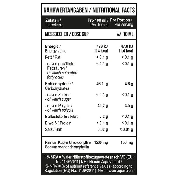 Zutaten: Wasser, Stabilisator (Glycerin), Kupferkomplexe der Chlorophylline, Aroma, Säuerungsmittel (Citronensäure), Verdickungsmittel (Xanthan), Konservierungsstoff (Kaliumsorbat), Emulgator (Mono- und Diglyceride von Speisefettsäuren)