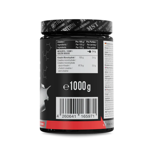 MST Creatin Monohydrate 1000 g ist ein Nahrungsergänzungsmittel in Pulverform mit 100 % Kreatin Monohydrat ohne Zusatzstoffe, hergestellt in Deutschland. Die Nettofüllmenge beträgt 1000 g Pulver. Das Produkt ist geschmacksneutral und frei von Farbstoffen oder Aromen. Es ist ultrafein vermahlen und zur Ergänzung der täglichen Kreatinaufnahme bestimmt.