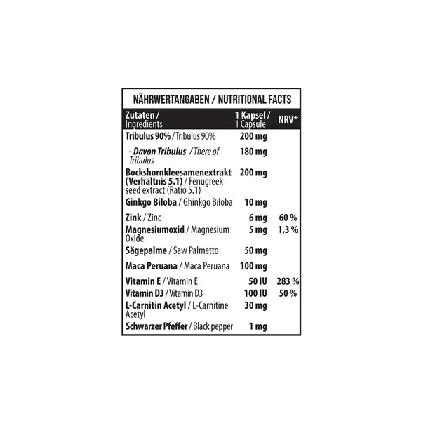 Zutaten: Bockshornkleesamen-Extrakt, Tribulus-Terrestris-Extrakt (90 % Saponine) (Frucht), pflanzliche Kapsel (HPMC), Maca-Extrakt 10:1 (Wurzel), Sägepalmen-Extrakt (Frucht), Vitamin E (dl-α-Tocopherylacetat), Acetyl-L-Carnitin-HCl, Zinkbisglycinat, Trennmittel: Magnesiumstearat, Ginkgo-biloba-Extrakt 10:1 (Blatt), Trennmittel: Calciumphosphat, Schwarzer-Pfeffer-Extrakt 10:1 (Frucht), Vitamin D (Cholecalciferol)
