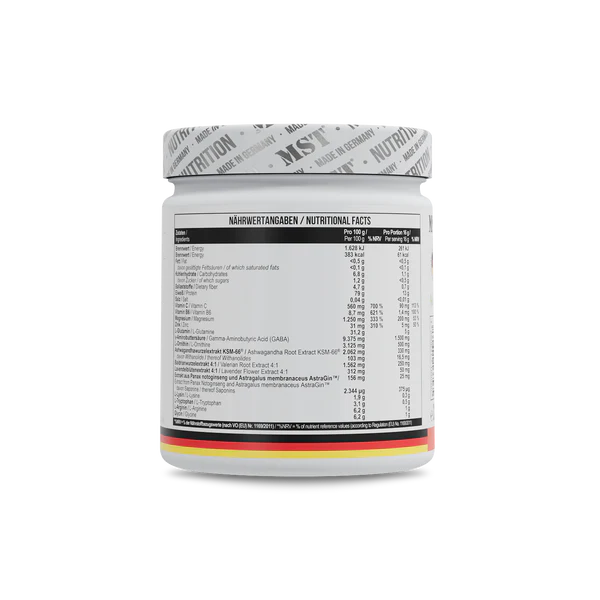 MST Good Night Sleep Formula 320 g Cherry ist ein Nahrungsergänzungsmittel in Pulverform mit einer Kombination aus L-Glutamin, GABA, Ashwagandha KSM-66®, L-Theanin, Lavendel, Panax Notoginseng, Astragalus membranaceus, L-Tryptophan, L-Arginin und Mikronährstoffen wie Magnesium, Zink und Vitamin B6 & C.