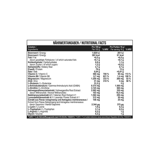 Zutaten: L-Glutamin, Säuerungsmittel (Citronensäure), γ-Aminobuttersäure, Magnesiumbisglycinat, L-Argininhydrochlorid, Glycin, Inulin, L-Ornithinhydrochlorid, Aroma, L-Tryptophan, Trennmittel (Siliciumdioxid), L-Lysin-Monohydrochlorid, Ashwagandhawurzelextrakt (KSM-66®), Färbendes Lebensmittel (Rote Betesaftpulver), Baldrianwurzelextrakt, L-Ascorbinsäure, Süßungsmittel (Sucralose, Acesulfam K), Lavendelblütenextrakt, Extrakt aus Panax notoginseng und Astragalus membranaceus (AstraGin™), Zinkbisglycinat, Pyridoxinhydrochlorid.