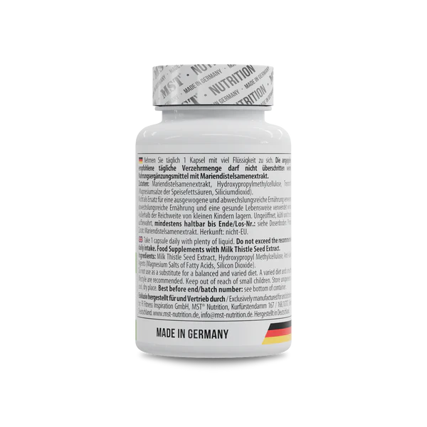 MST Milk Thistle 60 Kapseln ist ein Nahrungsergänzungsmittel in Kapselform mit Mariendistelextrakt (Silybum marianum). Jede Kapsel enthält standardisierten Mariendistelextrakt. Das Produkt dient der Ergänzung der täglichen Ernährung mit Mariendistel und wird in Kapselform angeboten.