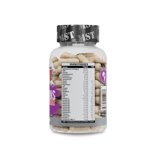 MST® Vitamins for WOMEN 90 Kapseln ist ein Nahrungsergänzungsmittel in Kapselform, das speziell für Frauen entwickelt wurde und eine Mischung aus Vitaminen, Mineralstoffen und weiteren Komponenten wie Kollagen, MSM, Hyaluronsäure, Bromelain, Cholin und Coenzym Q10 enthält. Die Zusammensetzung richtet sich nach den Angaben des Herstellers und ist auf die ernährungsbedingte Versorgung erwachsener Frauen ausgerichtet. Die Kapseln liefern eine Vielzahl von Vitaminen und Mineralstoffen sowie zusätzliche Stoffe zur Unterstützung verschiedener Stoffwechselfunktionen und Körperstrukturen.