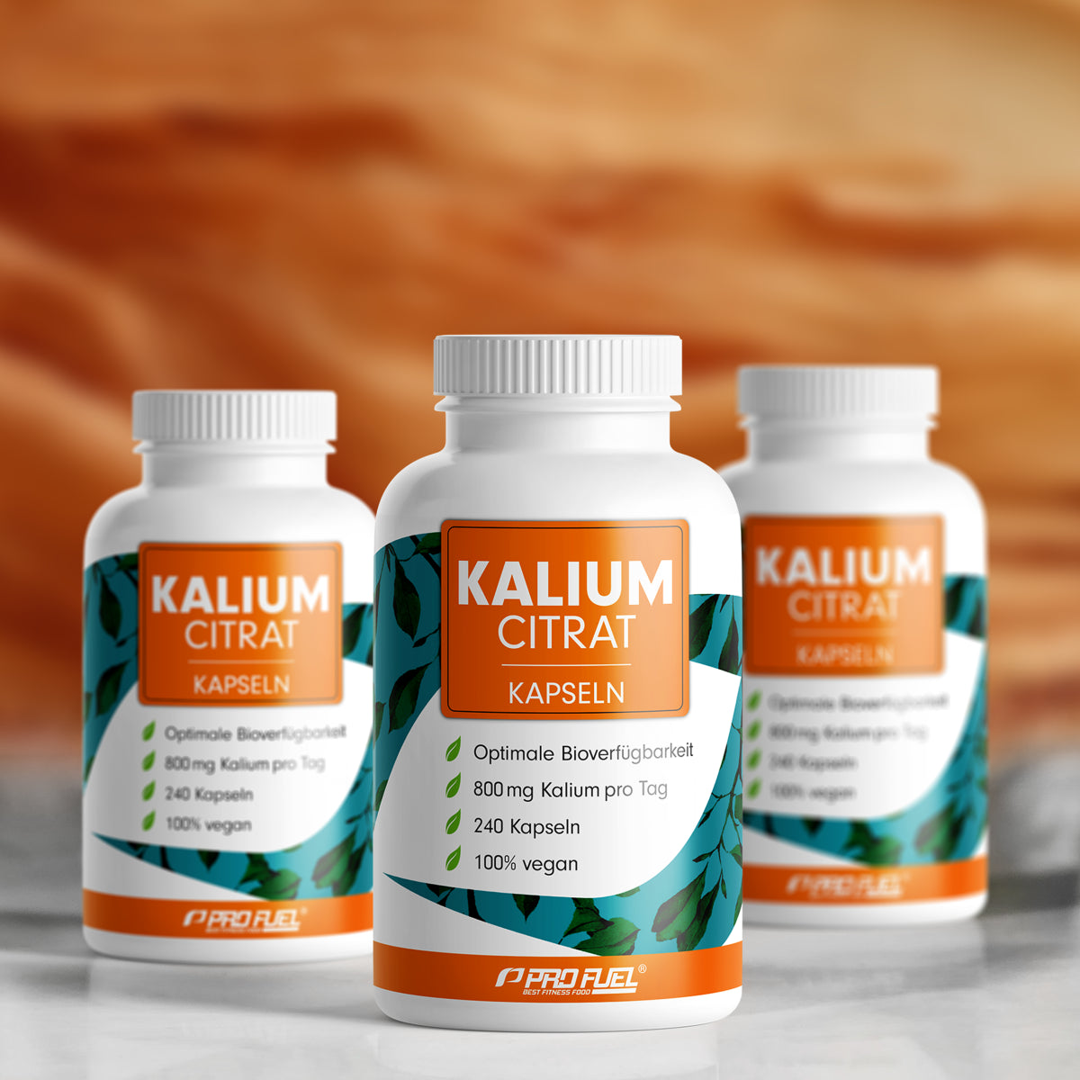ProFuel KALIUM Citrat 240 Kapseln ist ein Nahrungsergänzungsmittel in Kapselform mit organisch gebundenem Kalium. Die Tagesportion (2 Kapseln) liefert 800 mg Kalium, zur gezielten Ergänzung der Ernährung.